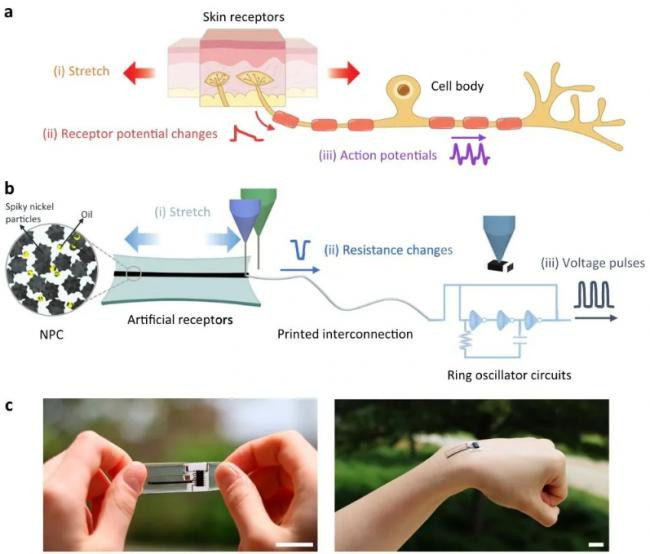 而工程化 NPC 材料则是实现仿生传感的关键。Mina Lee 团队在聚氨酯丙烯酸酯弹性体基质中,加入尖刺镍颗粒和邻苯二甲酸二辛酯油,形成了独特的量子隧穿复合材料。油的加入有效降低了颗粒间摩擦,使材料应变范围突破 50%,同时显著减小了滞后性;尖刺镍颗粒通过电场集中效应促进量子隧穿,实现了超过 6 个数量级的电阻变化,完美匹配了生物 SA-II 感受器的信号特征。通过调节镍颗粒浓度、油含量和交联密度,还可精准调控材料的开关电导率、应变灵敏度等关键参数,满足不同应用场景需求。