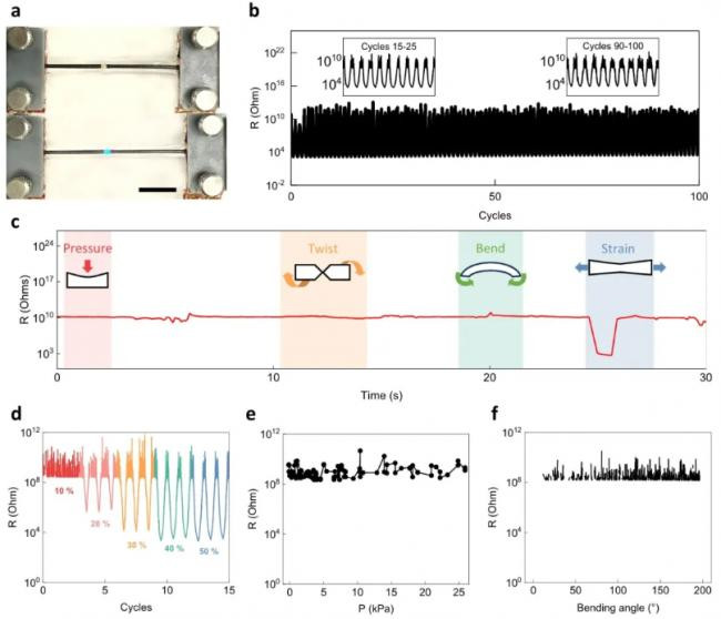 在稳定性测试中,该系统经过 100 次 50% 应变循环后,仍能保持稳定的电学性能,初期 15 次循环后的微小漂移会逐渐趋于平稳。更值得关注的是,该传感器具有极强的刺激选择性,对拉伸应变的响应远高于压力、弯曲、扭转等其他刺激,精准复刻了生物 SA-II 感受器的专属传感特性。